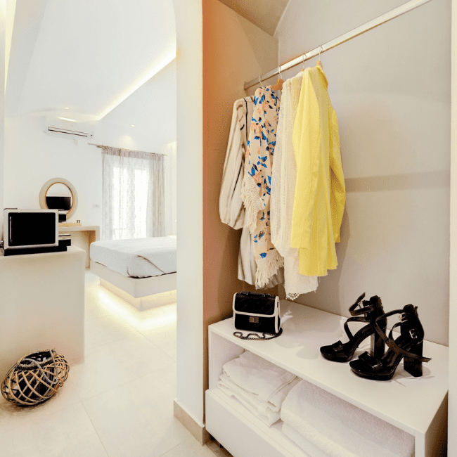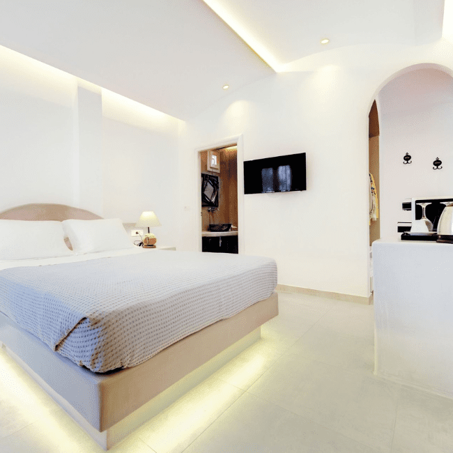 The Standard Suite offers a practical and comfortable accommodation option in the center of Santorini. Designed for two guests, it combines functional layout with clean Cycladic aesthetics.